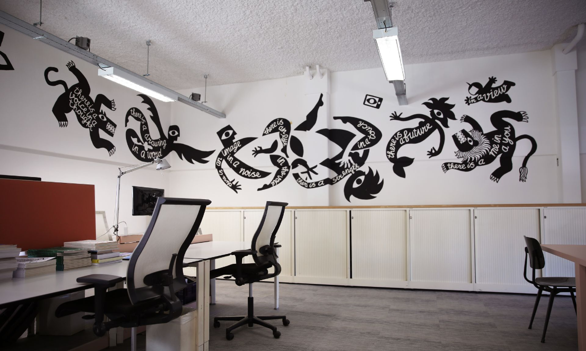 Foto: de achterwand van het kantoor is geïllustreerd door grafisch ontwerper Max Kisman (op bovenstaande foto’s is de illustratie nog niet te zien)